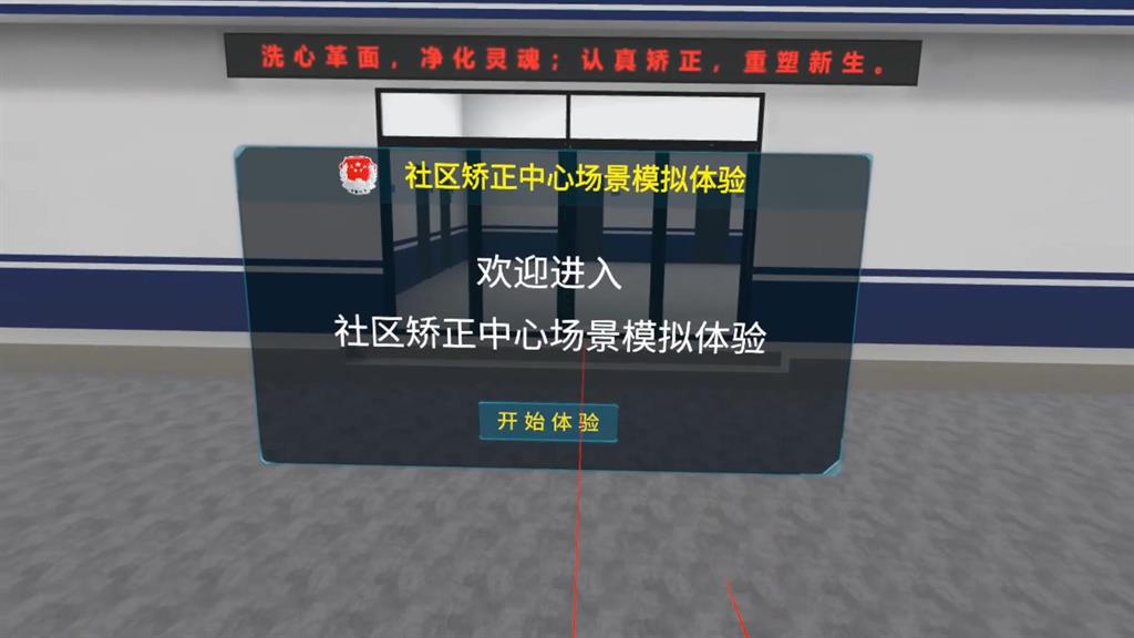 進(jìn)入VR場(chǎng)景,體驗(yàn)者站在社區(qū)矯正中心大門(mén)前,點(diǎn)擊手柄即可進(jìn)入內(nèi)部。大廳內(nèi),系統(tǒng)語(yǔ)音隨即介紹中心的主要職責(zé)與區(qū)域劃分。隨后,體驗(yàn)者可自由漫游至各功能室,系統(tǒng)會(huì)詳細(xì)介紹每室的功能及在社區(qū)矯正中的作用。此外,大廳還設(shè)有互動(dòng)答題環(huán)節(jié),增強(qiáng)體驗(yàn)趣味性與知識(shí)性。