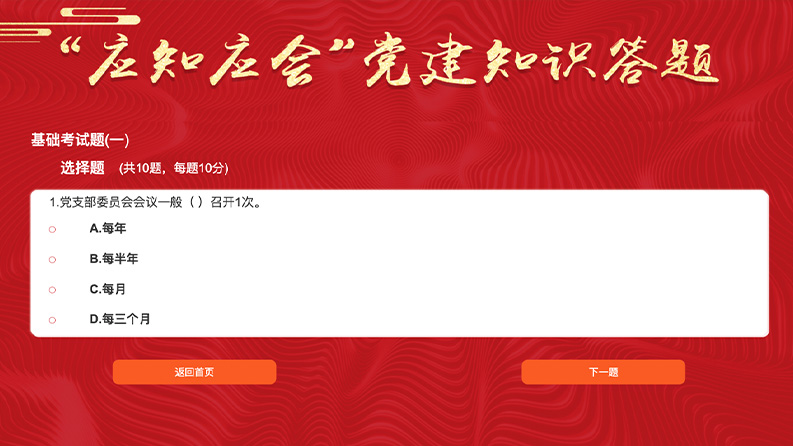 定制軟件,內(nèi)容題庫類型如:應(yīng)知應(yīng)會(huì),十九大報(bào)告等相關(guān)題庫。智慧答題系統(tǒng)提供答題服務(wù),黨員群眾通過答題來選擇正確的選項(xiàng)。軟件功能: