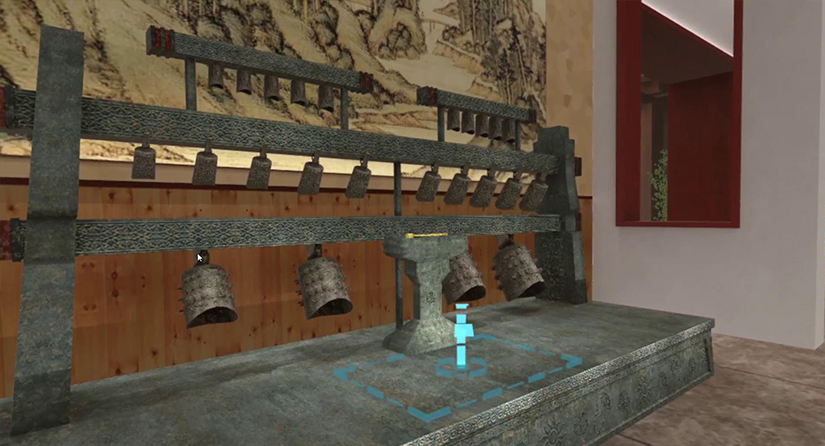 樂,即古代所指六樂:《云門大卷》、《咸池》、《大韶》、《大夏》、《大濩》、《大武》六套樂舞,是我國古代音樂藝術(shù)的經(jīng)典范式。展廳將直觀展示古樂的編鐘與鼓的樣式結(jié)構(gòu),并可以通過VR設(shè)備(手柄)去敲擊編鐘與鼓聽到真實的聲音,全部聲音使用的是原件文物實地采音,非常真實。