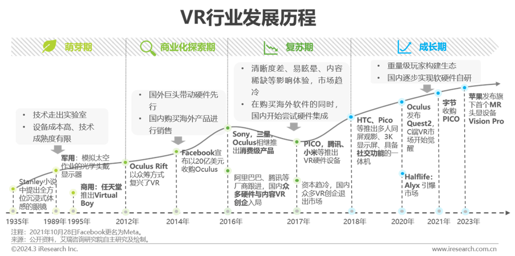 虛擬現(xiàn)實概念源于科幻小說,由任天堂等游戲廠商開啟商業(yè)化之路。早期設(shè)備成本高,技術(shù)成熟度有限,游戲廠商的嘗試都宣告失敗。2016年是虛擬現(xiàn)實的元年,硬件巨頭消費級產(chǎn)品的推出,疊加中國眾多VR創(chuàng)企大力進軍硬件端與內(nèi)容端,短期市場呈爆炸式增長。但行業(yè)整體處于民用初期,受內(nèi)容稀缺、設(shè)備易眩暈、屏幕清晰度差等影響,消費級市場整體發(fā)展放緩。伴隨行業(yè)技術(shù)日趨成熟與產(chǎn)業(yè)玩家的擴容,行業(yè)在2020-2022年邁入發(fā)展的關(guān)鍵階段,Quest銷量迎消費級拐點。2023年蘋果Vision Pro發(fā)布,其對全新交互方式的實踐為業(yè)內(nèi)玩家?guī)硇碌乃伎?。作為現(xiàn)階段頂配產(chǎn)品,Vision Pro的出現(xiàn)不僅極大拉動虛擬現(xiàn)實產(chǎn)業(yè)玩家信心,同時在市場激起的“浪花”,為行業(yè)帶來更多關(guān)注。艾瑞認(rèn)為,在可預(yù)見的27~28年,蘋果二代甚至三代產(chǎn)品將貢獻下一個里程碑,為產(chǎn)業(yè)帶來新的爆發(fā)。