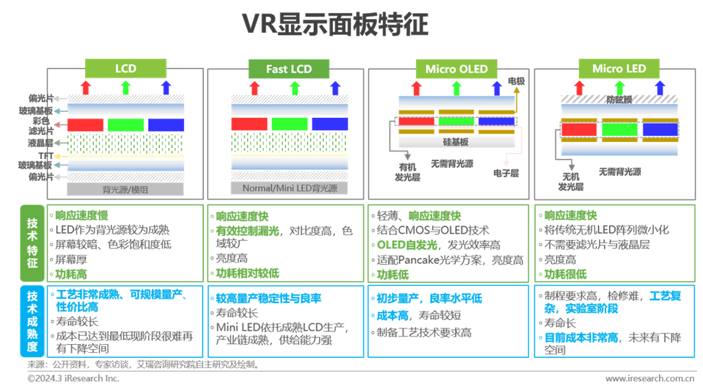 早期VR頭顯大部分采用LCD,礙于LCD響應(yīng)速度慢,從2016年起,玻璃基OLED被嘗試應(yīng)用于VR設(shè)備中。當(dāng)前的VR設(shè)備主要采用Fast LCD屏幕,該類型顯示屏在響應(yīng)速度、量產(chǎn)穩(wěn)定性、良率與成本等方面均有所改善。伴隨顯示方案的步步迭代,2022年起,VR產(chǎn)業(yè)頭部企業(yè)開始研發(fā)帶有Mini LED的Fast LCD顯示面板與Micro OLED面板,以求在對比度、刷新率、亮度、光效等方面獲得進一步提升。顯示屏亮度與對比度的提升,更好的適配了Pancake光學(xué)方案對高亮度的需求。值得一提的是,相較于Micro OLED的性能優(yōu)勢,Micro LED在屏幕輕薄度、光效、顯示性能等方案更為出色,目前以蘋果、三星為首的企業(yè)正積極布局,是未來VR顯示面板的理想選擇。