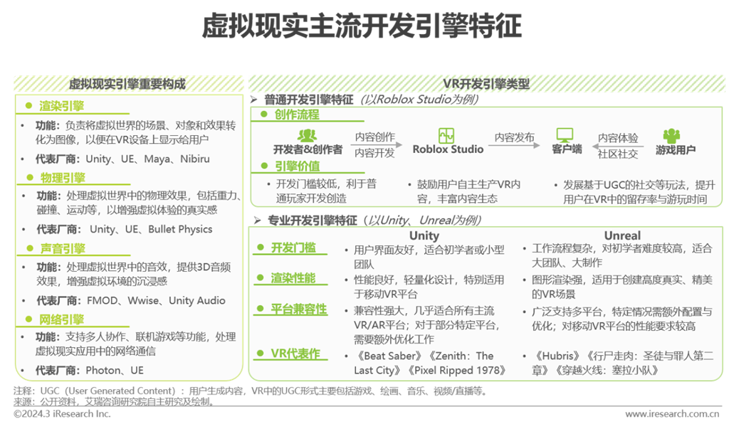 引擎平臺將軟件系統(tǒng)分解為若干功能模塊,以此來提高軟件開發(fā)效率、降低開發(fā)成本并增強軟件系統(tǒng)的可拓展性。VR產(chǎn)品強調(diào)交互體驗,開發(fā)前期需要實驗驗證,確保核心設(shè)計點符合VR場景。目前應(yīng)用于VR的開發(fā)引擎以Unity和Unreal為主,在物理模型創(chuàng)建、圖像渲染、系統(tǒng)渲染等方面具備良好性能,因為該類型開發(fā)引擎具備一定使用難度,主要供程序員、開發(fā)者等專業(yè)人員使用。近兩年來VR行業(yè)玩家均在積極推進內(nèi)容生態(tài)的構(gòu)建,加之元宇宙產(chǎn)業(yè)的迅速發(fā)展和AIGC刮起的新一輪科技熱潮,企業(yè)鼓勵普通用戶自主生產(chǎn)內(nèi)容,并提供開發(fā)門檻較低的創(chuàng)作工具,激發(fā)玩家進行UGC創(chuàng)作,同步強化內(nèi)容與社交生態(tài)。