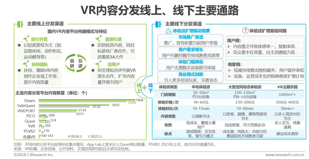 內(nèi)容分發(fā)平臺打破內(nèi)容碎片化,聚合的豐富內(nèi)容可匹配用戶不同興趣與需求。內(nèi)容分發(fā)渠道分為:(1)線上:由內(nèi)容分發(fā)平臺主導(dǎo),為用戶提供在線購買、下載和體驗服務(wù)。目前線上分發(fā)渠道以各硬件廠商自行搭建為主,暫未出現(xiàn)第三方內(nèi)容分發(fā)平臺布局。從內(nèi)容數(shù)量角度,國外平臺占主導(dǎo)地位,其中Steam作為傳統(tǒng)游戲平臺,憑借多年積累優(yōu)勢,VR內(nèi)容數(shù)量一路領(lǐng)跑;國內(nèi)VR應(yīng)用商店加速追趕,盡管內(nèi)容體量仍無法同海外頭部廠商抗衡,但通過自研與引進兩種模式,內(nèi)容量快速擴充。數(shù)量并非絕對標(biāo)志,但多樣選擇為呈現(xiàn)優(yōu)質(zhì)內(nèi)容提供更大可能。(2)線下:多指B to C線下游藝門店,以VR體驗店為主。伴隨疫情開放,線下娛樂由停滯狀態(tài)開始不斷回溫,逐漸受到更多關(guān)注;如能有效緩解用戶與商家側(cè)面臨問題,VR體驗店有望成為VR產(chǎn)品出貨的重要支撐。
