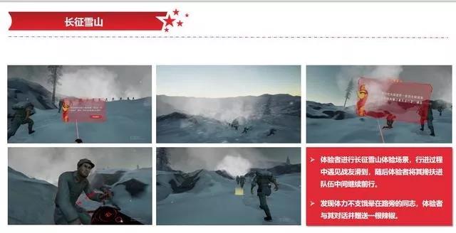 工作人員戴上VR眼鏡,可以重溫長征路,體驗當年農(nóng)軍爬雪山的艱難。在雪山體驗場景里,你將扮演一名紅軍戰(zhàn)士,在行進過程中遇見戰(zhàn)友滑到,遇見體力不支餓暈在路旁的同志,還會遇見教科書本上為了革命而犧牲的軍需處長。這些原本在教課書上發(fā)生的故事情節(jié),通過VR我們蹦栩栩如生在眼前展示。