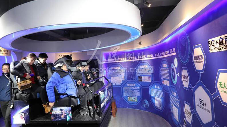 2021年1月1日,市民在江蘇南通科技館5G+展區(qū)參觀體驗。南通科技館新設的5G+展區(qū)在2021年元旦小長假正式與觀眾見面,新奇的體驗設備吸引了眾多市民參觀體驗5G動感平臺、VR海底漫游、5G模擬飛行駕駛等項目,并參觀科技館機器人表演。