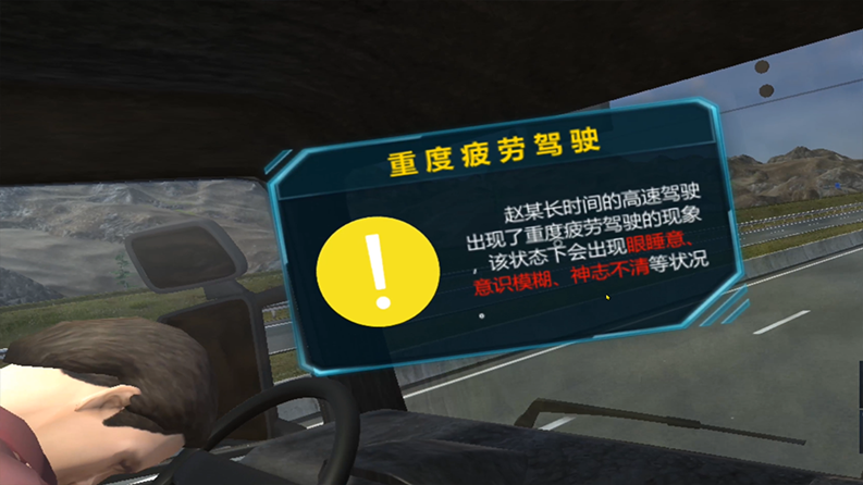 隨著夏季高溫和物流旺季的到來,疲勞駕駛問題日益突出,尤其是對于夜間行駛的貨車駕駛員。駕駛員在疲勞的情況下駕駛車輛,會(huì)感到困倦瞌睡,四肢無力,注意力不集中,判斷能力下降,甚至出現(xiàn)精神恍惚或瞬間記憶消失,出現(xiàn)動(dòng)作遲誤或過早,操作停頓或修正時(shí)間不當(dāng)?shù)炔话踩蛩?,極易發(fā)生道路交通事故。體驗(yàn)者將會(huì)體驗(yàn)到在高速上體驗(yàn)到輕微疲勞駕駛、中度疲勞駕駛、重度疲勞駕駛以及疲勞駕駛應(yīng)急處理措施等。