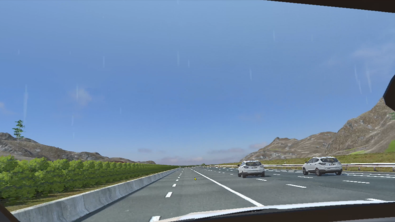 場景以現(xiàn)實(shí)場景為模板,模擬杭金衢金華方向4車道,至新嶺隧道時(shí)為5車道,有新老隧道,左側(cè)老隧道2車道,右側(cè)3車道,出隧道后新老隧道分界線為實(shí)線,前方為直埠樞紐,左側(cè)為金華方向,右側(cè)轉(zhuǎn)入溫州方向,經(jīng)常有車從第一、二車道變道,導(dǎo)致后方貨車來不及反應(yīng),造成事故,雨天事故尤為突出。