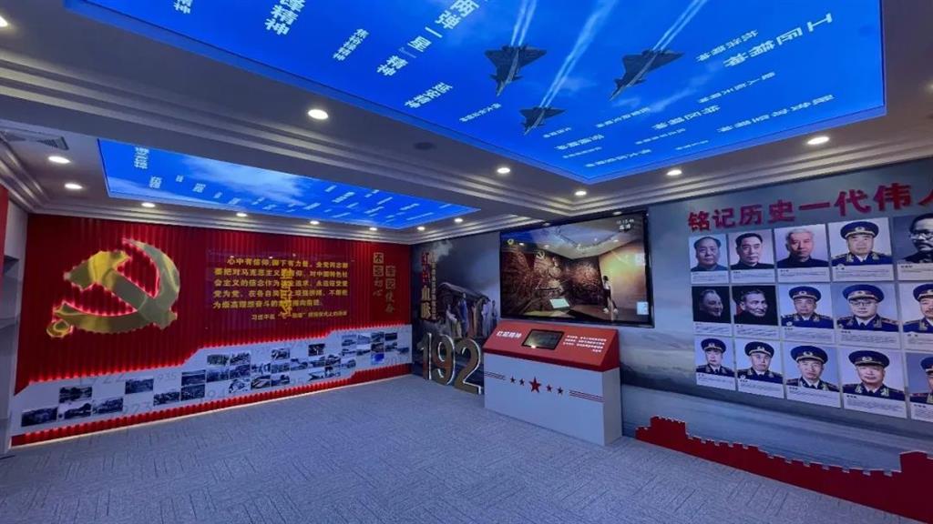 展館以黨建文化為主題,分別以“不忘初心、牢記使命”、“紅色血脈”、“紅色記憶”、“紅星閃耀”、“搏擊長空”5大展項展開闡述黨與軍人的故事。