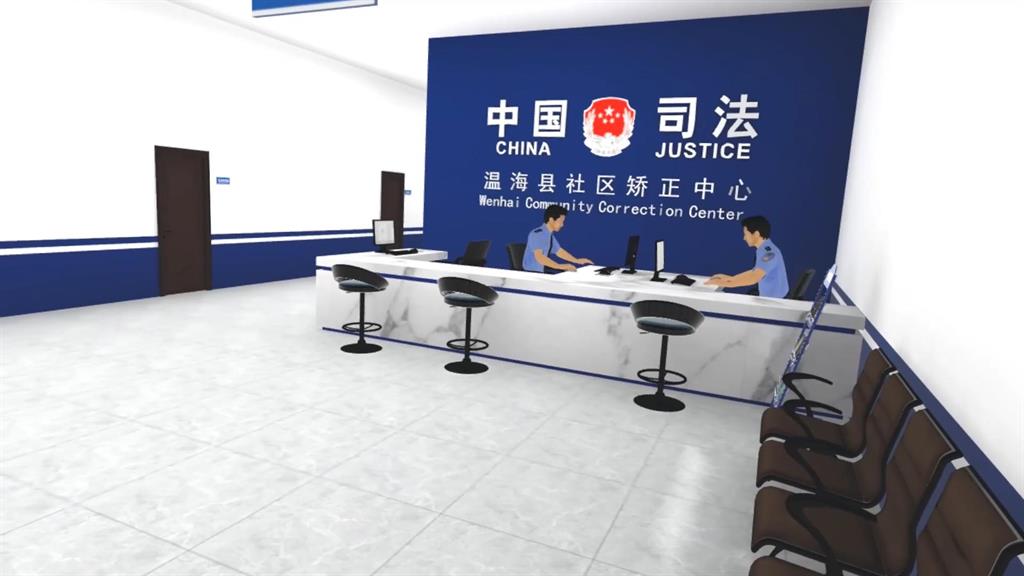 進(jìn)入VR場(chǎng)景,體驗(yàn)者站在社區(qū)矯正中心大門(mén)前,點(diǎn)擊手柄即可進(jìn)入內(nèi)部。大廳內(nèi),系統(tǒng)語(yǔ)音隨即介紹中心的主要職責(zé)與區(qū)域劃分。隨后,體驗(yàn)者可自由漫游至各功能室,系統(tǒng)會(huì)詳細(xì)介紹每室的功能及在社區(qū)矯正中的作用。此外,大廳還設(shè)有互動(dòng)答題環(huán)節(jié),增強(qiáng)體驗(yàn)趣味性與知識(shí)性。