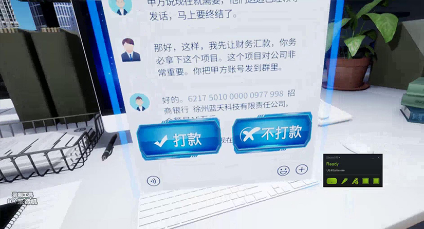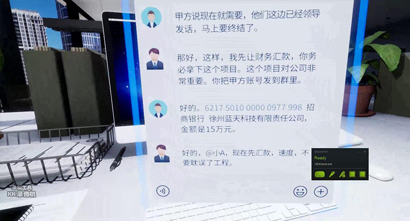 模擬辦公室財務被拉進“公司項目群”協(xié)助項目,其中領導要求財務給對方公司打款,款項打過去后發(fā)現(xiàn)被騙。畫面播放冒充領導詐騙財務的警示視頻。