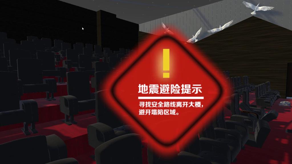 該VR軟件在電影院發(fā)生地震,首先要保持鎮(zhèn)靜,不能驚慌亂跑;隨機(jī)應(yīng)變躲到就近比較安全的地方,例如椅子旁邊、椅子下邊、墻根;如果離著安全出口非常近,可以沖到室外的安全地帶;地震停止后,在現(xiàn)場工作人的引領(lǐng)下,有序逃出,逃生時應(yīng)該保護(hù)好頭部。