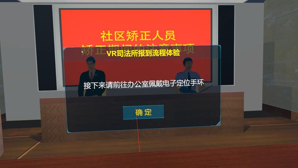 模擬整個(gè)司法報(bào)到和辦理社區(qū)矯正等流程,體驗(yàn)者以第一視角攜帶相關(guān)證明到司法所完成相應(yīng)的報(bào)到程序,包括進(jìn)入司法所、填寫信息、做心理健康測(cè)試、宣讀矯正規(guī)定、佩戴電子手環(huán)等。