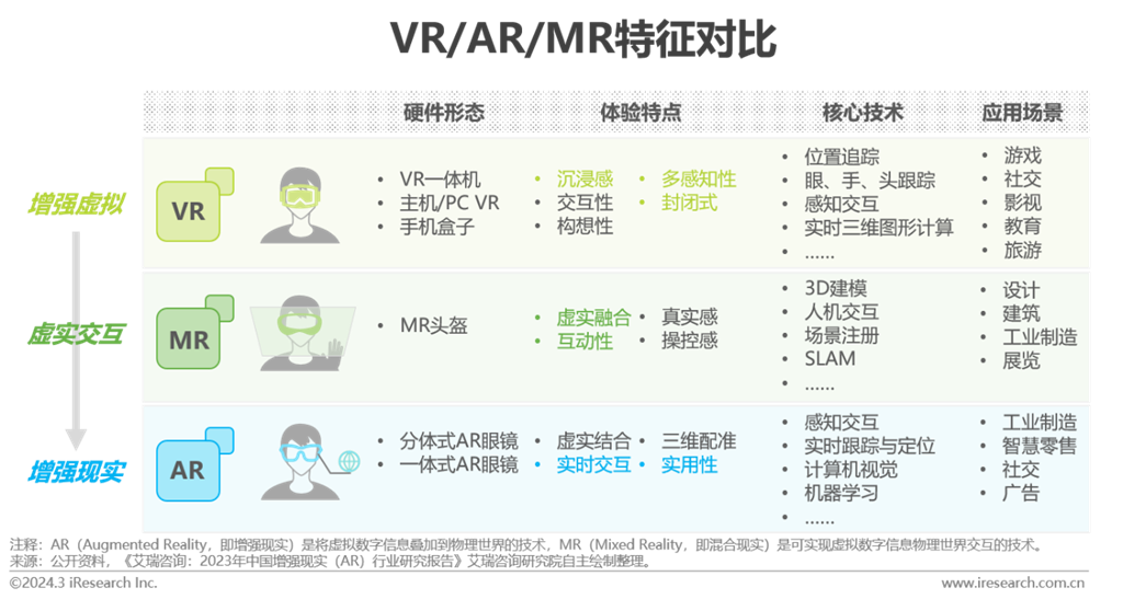 虛擬現(xiàn)實概念源于科幻小說,由任天堂等游戲廠商開啟商業(yè)化之路。早期設(shè)備成本高,技術(shù)成熟度有限,游戲廠商的嘗試都宣告失敗。2016年是虛擬現(xiàn)實的元年,硬件巨頭消費級產(chǎn)品的推出,疊加中國眾多VR創(chuàng)企大力進軍硬件端與內(nèi)容端,短期市場呈爆炸式增長。但行業(yè)整體處于民用初期,受內(nèi)容稀缺、設(shè)備易眩暈、屏幕清晰度差等影響,消費級市場整體發(fā)展放緩。伴隨行業(yè)技術(shù)日趨成熟與產(chǎn)業(yè)玩家的擴容,行業(yè)在2020-2022年邁入發(fā)展的關(guān)鍵階段,Quest銷量迎消費級拐點。2023年蘋果Vision Pro發(fā)布,其對全新交互方式的實踐為業(yè)內(nèi)玩家?guī)硇碌乃伎?。作為現(xiàn)階段頂配產(chǎn)品,Vision Pro的出現(xiàn)不僅極大拉動虛擬現(xiàn)實產(chǎn)業(yè)玩家信心,同時在市場激起的“浪花”,為行業(yè)帶來更多關(guān)注。艾瑞認(rèn)為,在可預(yù)見的27~28年,蘋果二代甚至三代產(chǎn)品將貢獻下一個里程碑,為產(chǎn)業(yè)帶來新的爆發(fā)。