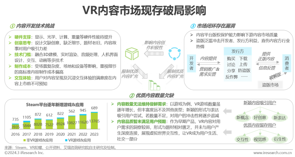 內(nèi)容側(cè):開發(fā)技術(shù)限制優(yōu)質(zhì)內(nèi)容創(chuàng)作輸出,加之內(nèi)容市場環(huán)境成熟度欠缺,優(yōu)質(zhì)正版內(nèi)容難以獲得有效保護,反向沖擊創(chuàng)作者信心,內(nèi)容市場閉環(huán)待完善