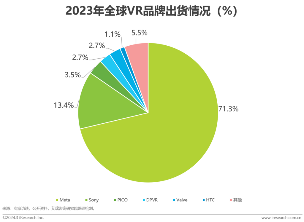 市場規(guī)模:2023年全球VR終端出貨量為765萬臺,其中Meta、Sony、PICO、DPVR和Valve位居前五。艾瑞預(yù)估2024年全球出貨將突破810萬臺。伴隨生態(tài)成熟與新品迭現(xiàn),特別是蘋果迭代產(chǎn)品對于市場的引爆可能性,艾瑞預(yù)估,2027年全球市場將有飛躍式增長