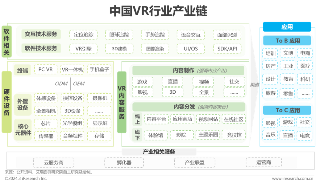 VR產(chǎn)業(yè)具備相對完整與龐大的產(chǎn)業(yè)鏈條,主要由硬件、軟件、內(nèi)容服務(wù)及應(yīng)用領(lǐng)域四部分構(gòu)成。光學(xué)、顯示與交互是VR硬件架構(gòu)的核心構(gòu)成。目前VR硬件條件基本支持VR游戲在設(shè)備上的流暢運行,但隨著眼球追蹤、手勢追蹤等交互技術(shù)的出現(xiàn)與發(fā)展,渲染技術(shù)對算力需求的提升,硬件與軟件的適配性將直接影響用戶體驗。硬件與軟件端的發(fā)力也帶動起內(nèi)容生態(tài)的繁榮,產(chǎn)業(yè)不再局限于游戲、社交,工業(yè)、醫(yī)療、零售等新業(yè)態(tài)也將加入,業(yè)態(tài)日趨豐富。