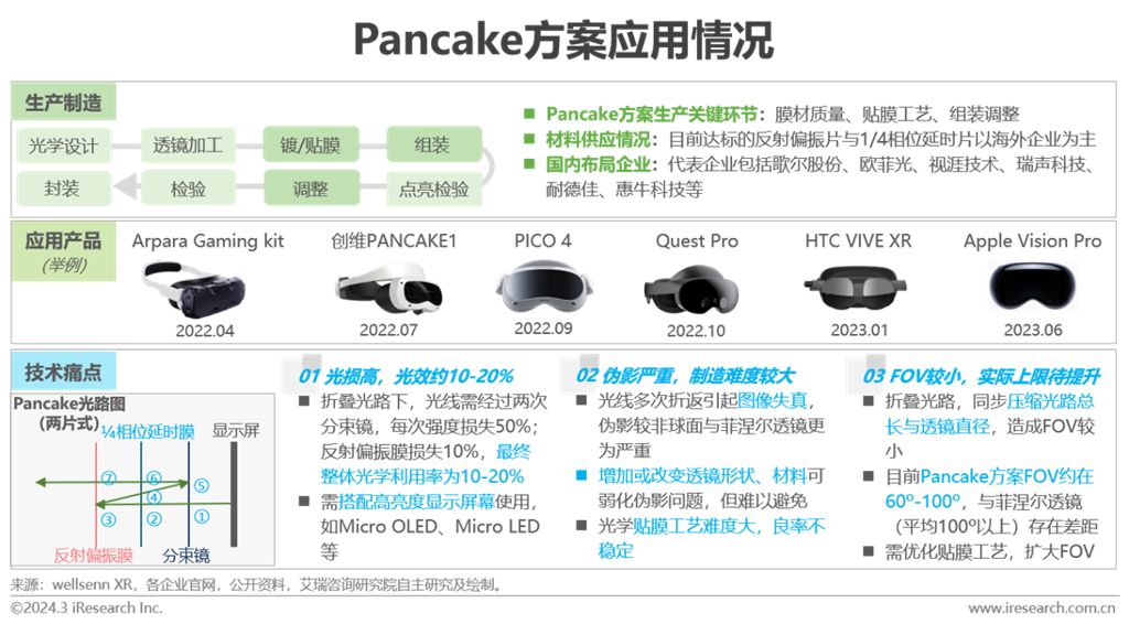 Pancake方案對頭顯的“瘦身”吸引了業(yè)內(nèi)多方的關(guān)注,近2年已有多款企業(yè)級、消費級的頭顯產(chǎn)品問世,包括蘋果推出的MR產(chǎn)品Vision Pro,再一次將Pancake帶進大眾視野。新方案的落地為VR市場注入新鮮活力,設(shè)備迭代加速,屏幕等配套設(shè)備相應(yīng)升級,輕薄、成像質(zhì)量好的佩戴體驗進一步促進VR向大眾市場滲透。但Pancake方案并非十全十美,基于方案設(shè)計本身,在光效、FOV等方面有所犧牲。為提升方案的使用性能,制造工藝難度提高,成本隨之上升。故Pancake方案依舊是一個偏向過渡的產(chǎn)品形態(tài),未來一段時間業(yè)內(nèi)各方仍需在方案則選、產(chǎn)品體驗與制造成本等多因素間尋找平衡。