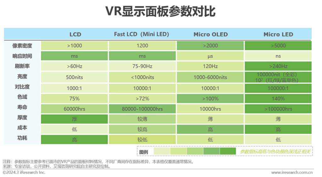 作為VR頭顯近期的主流選擇,F(xiàn)ast LCD(Mini LED)依托全新液晶材料與超速驅(qū)動技術(shù),有效提升刷新率至75-90Hz。相較傳統(tǒng)LCD屏幕,F(xiàn)ast LCD兼顧提高屏幕亮度和對比度,增強對暗部區(qū)域顯示的控制,提高飽和度。Micro OLED在分辨率與刷新率方面的優(yōu)勢性能可分別有效緩解紗窗效應(yīng)與余暉效應(yīng),降低眩暈感對用戶體驗的負面影響。盡管OLED長時間顯示靜止畫面存在燒屏可能,但VR畫面通常會隨著佩戴者頭部運動而變化,畫面多數(shù)處于變化中,燒屏問題可得到緩解。Micro LED具備絕對亮度與對比度優(yōu)勢,相同功耗下可提供更長久的續(xù)航。綜合多維度信息,F(xiàn)ast LCD與Micro OLED將在短期內(nèi)不斷滲透,特別是Micro OLED,量產(chǎn)后規(guī)模效應(yīng)下成本將下降。而各維度更勝一籌的Micro LED,待巨量轉(zhuǎn)移和全彩化方案等技術(shù)瓶頸突破后,在VR頭顯有望實現(xiàn)全面搭載。