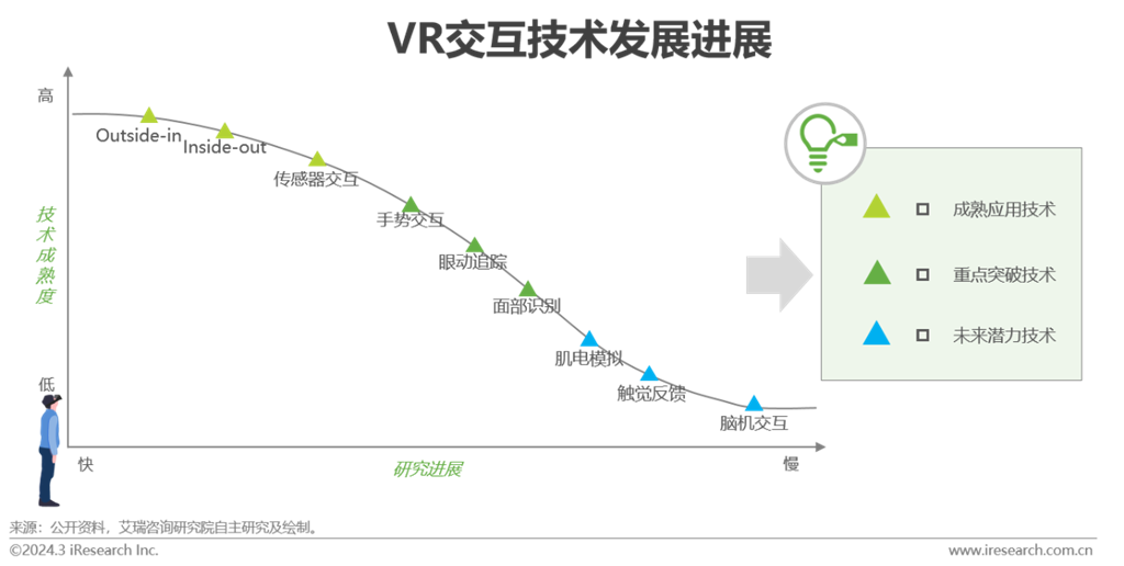 交互技術(shù)是用戶與虛擬世界互動的手段,扮演著連接用戶與虛擬環(huán)境的橋梁角色。VR產(chǎn)業(yè)的爆發(fā)式發(fā)展,同步帶來交互技術(shù)的更迭。為實現(xiàn)自然、沉浸的交互,技術(shù)單打獨斗已無法滿足現(xiàn)階段需求;整合不同類型技術(shù),將覆蓋多角度、多領(lǐng)域采集信息,進而達到更為精準(zhǔn)的交互效果,因此交互技術(shù)整體呈現(xiàn)融合態(tài)勢。目前,發(fā)展最為成熟的6DoF頭手追蹤定位技術(shù)已廣泛應(yīng)用于國內(nèi)外多款VR產(chǎn)品。依托傳感器反饋的傳感器交互與觸覺反饋技術(shù)通常配置于VR控制器和VR穿戴設(shè)備,增強用戶對虛擬物體的觸感。手勢交互、眼動追蹤及面部識別等聚焦用戶生理特征、動作行為的交互技術(shù),極大的提高了用戶參與度,為用戶構(gòu)建的虛擬角色和虛擬環(huán)境間的動作、情感響應(yīng)提供支撐。交互技術(shù)的發(fā)展整體趨向無感化,肌電模擬、腦機交互這些直接從身體或大腦向虛擬環(huán)境傳輸指令的交互形式也是行業(yè)的興趣所在。