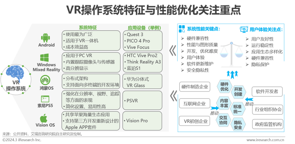 底層的VR操作系統(tǒng)處于虛擬現(xiàn)實應(yīng)用程序與硬件之間,承擔(dān)管理硬件資源、提供驅(qū)動程序支持、處理輸入與輸出,協(xié)調(diào)傳感器數(shù)據(jù)等任務(wù)。早期的VR一體機基本沿襲了手機端的計算芯片與操作系統(tǒng),目前依舊以安卓系統(tǒng)為主,包括部分品牌機型的深度定制的UI。安卓系統(tǒng)為開源屬性,擁有龐大的開發(fā)者支持,具備跨平臺兼容性;利用安卓的現(xiàn)成基礎(chǔ),廠商可以自行定制修改,快速推出VR新品。雖然安卓在業(yè)內(nèi)占據(jù)主導(dǎo)地位,但有部分制造商選擇開發(fā)自己的專有系統(tǒng),以滿足特定需求或為產(chǎn)品提供差異化屬性。目前,分體式的VR設(shè)備,包括PC VR、PSVR和華為VR Glass超短焦手機VR,操作系統(tǒng)以主機為主,同時涉及Windows MR、索尼PS和華為鴻蒙OS。蘋果Vison Pro搭載的Vision OS是一款VR/AR操作系統(tǒng),旨在提供沉浸式、交互性強的虛擬體驗。Vision OS可兼容iphone和ipad數(shù)十萬款應(yīng)用,并內(nèi)嵌了iOS和空間計算框架、空間音頻引擎、注視點渲染引擎等?;诙嗄赀\營的生態(tài)優(yōu)勢,蘋果可擴速擴張Vision OS,搭建圍繞Vision OS的內(nèi)容與開發(fā)者生態(tài),對整個XR行業(yè)起拉動作用。