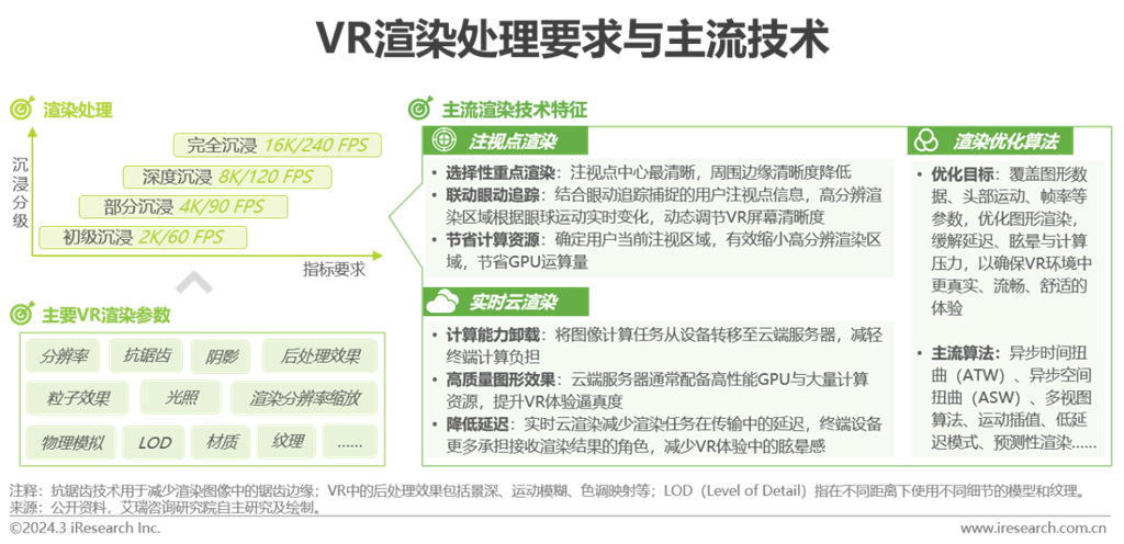 渲染處理主要涉及(1)內(nèi)容渲染:在VR環(huán)境中創(chuàng)建、生成各種元素、場景、對象與效果和(2)終端渲染:對生成的內(nèi)容進行畸變、色散等校正并呈現(xiàn)到用戶終端設(shè)備。為匹配用戶的進階需求,當(dāng)前的VR渲染處理已跨越初級階段向部分沉浸階段邁進,在畫質(zhì)、速度、成本等多方面尋求質(zhì)量與效率間的平衡。相較于普通的3D渲染,VR渲染注重用戶體驗的全方位性,在幀率、延遲、交互控制、立體聲視圖、性能優(yōu)化等方面均有更高要求。作為連接用戶與虛擬環(huán)境的橋梁,渲染在VR中扮演重要角色,需要高規(guī)格硬件算力設(shè)備、成熟的XR可穿戴智能終端、優(yōu)化的渲染算法及逐步系統(tǒng)化的云渲染模式等技術(shù)的協(xié)同推動。當(dāng)前階段,得益于眼動追蹤技術(shù)的成熟,注視點渲染吸引更多業(yè)內(nèi)玩家嘗試,如Quest Pro、PS VR 2、PICO 4 Pro等越來越多的VR設(shè)備已在產(chǎn)品中配置。AI算法的成熟應(yīng)用,為渲染模型提供大量圖像、視頻數(shù)據(jù),VR場景質(zhì)量更為逼真。云化架構(gòu)將渲染能力導(dǎo)入云端,云邊協(xié)同有助于降低終端配置成本,改善時延、抖動等問題。在硬件算力仍有不足的情況下,ATW、ASW等優(yōu)化算法也成為VR產(chǎn)品標(biāo)配,以降低虛擬世界的渲染復(fù)雜性,進而緩解延遲與滯后。