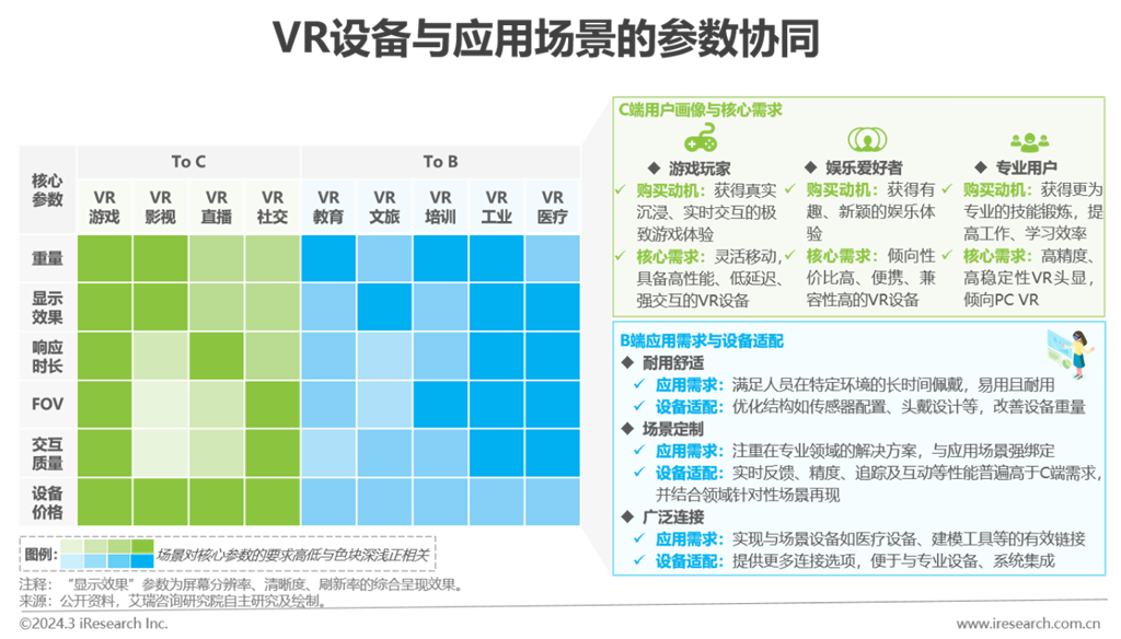 對于消費級領(lǐng)域,游戲是VR在C端落地最早且相對成熟的場景,VR游戲用戶的行業(yè)教育程度最深,導(dǎo)致其對VR產(chǎn)品及服務(wù)的敏感性增強。行業(yè)后續(xù)衍生的C端場景中,直播、社交等聚焦動態(tài)與實時交互的細分應(yīng)用對響應(yīng)時長、交互質(zhì)量更為關(guān)注。VR影視更多依賴預(yù)先開發(fā)內(nèi)容,應(yīng)用重點在于展示。對于行業(yè)級領(lǐng)域,工業(yè)、醫(yī)療等技術(shù)門檻高的場景較為關(guān)注VR設(shè)備的可操作性,因而與應(yīng)用效果直接關(guān)聯(lián)的各項參數(shù),均為該場景的關(guān)注重點。在教育、培訓(xùn)等場景,VR技術(shù)與產(chǎn)品的應(yīng)用價值多體現(xiàn)為對行業(yè)工作模式的創(chuàng)新改革,領(lǐng)域用戶對VR技術(shù)、服務(wù)性能容忍度更高。