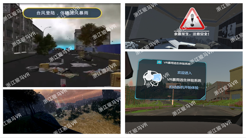 自然災(zāi)害體驗(yàn)系統(tǒng)中包含了“VR泥石流災(zāi)害自救與逃生”、“VR臺(tái)風(fēng)天氣預(yù)防”、“VR暴風(fēng)雨逃生演練系統(tǒng)”、“VR地震逃生體驗(yàn)”等。讓體驗(yàn)者在各不同場(chǎng)景中學(xué)習(xí)如何應(yīng)對(duì)自然災(zāi)害等突發(fā)事件,如何進(jìn)行安全預(yù)防避險(xiǎn)等安全知識(shí)。