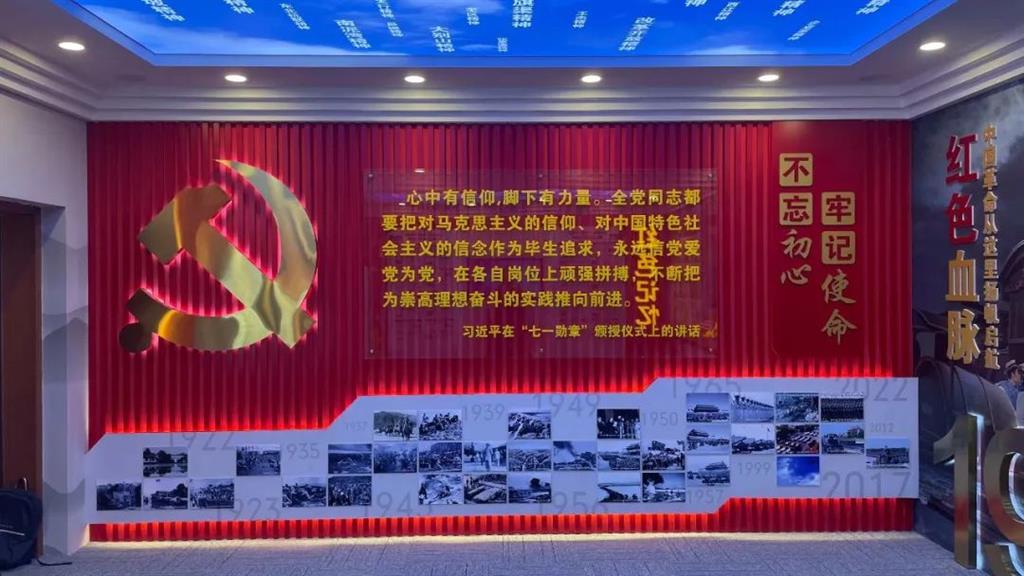 展館以黨建文化為主題,分別以“不忘初心、牢記使命”、“紅色血脈”、“紅色記憶”、“紅星閃耀”、“搏擊長空”5大展項展開闡述黨與軍人的故事。