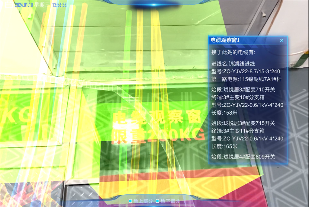 巡檢模式下,ipad的拍攝模式一直打開,然后工作人員拿著ipad于室外指定區(qū)域行走,對著展示的電纜井或電纜管線,點擊對應(yīng)模型,可以打開數(shù)據(jù)面板或電纜截面圖(電纜井為數(shù)據(jù)面板,電纜管線為截面圖),點擊截面圖上標識名稱的管線截面,可以打開對應(yīng)的管線數(shù)據(jù)面板。